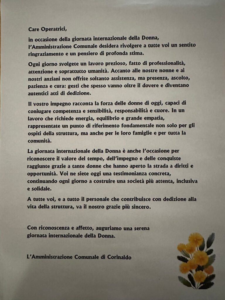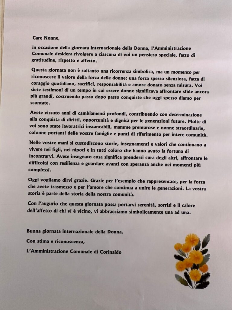 Durante la mattinata l’Amministrazione Comunale ha voluto dedicare un pensiero speciale alle nostre nonne, ringraziandole per la loro storia, la loro forza e per il prezioso esempio che continuano a rappresentare per tutta la comunità e alle operatrici che ogni giorno, con impegno e dedizione, si prendono cura dei nostri ospiti.